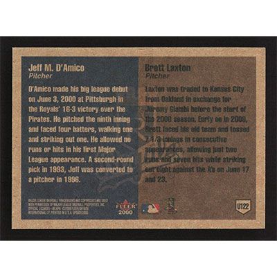 This is a 2000 Fleer Tradition Update Jeff M. D'Amico and Brett Laxton baseball card. The card is #U122 and pictures show condition. Team(s): Kansas City Royals Rookie Card (RC)