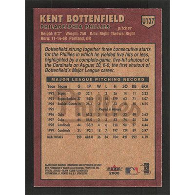 This is a 2000 Fleer Tradition Update Kent Bottenfield baseball card. The card is #U137 and pictures show condition.