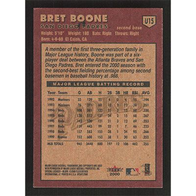 This is a 2000 Fleer Tradition Update Bret Boone baseball card. The card is #U15 and pictures show condition.