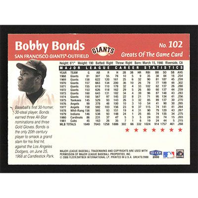 This is a 2000 Greats of the Game Bobby Bonds baseball card. The card is #102 and pictures show condition.