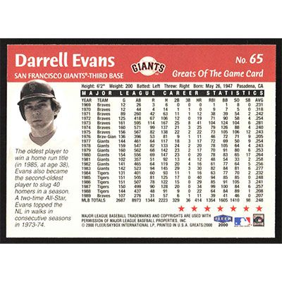 This is a 2000 Greats of the Game Darrell Evans baseball card. The card is #65 and pictures show condition.