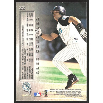 This is a 2000 Metal Alex Gonzalez baseball card. The card is #22 and pictures show condition.