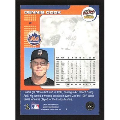 This is a 2000 Pacific Dennis Cook baseball card. The card is #275 and pictures show condition.