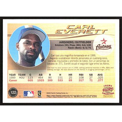 This is a 2000 Pacific Crown Collection Carl Everett baseball card. The card is #122 and pictures show condition.