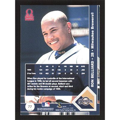This is a 2000 Pacific Omega Ron Belliard baseball card. The card is #77 and pictures show condition.