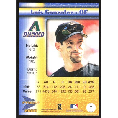 This is a 2000 Pacific Prism Luis Gonzalez baseball card. The card is #7 and pictures show condition.