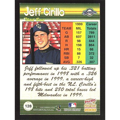 This is a 2000 Paramount Jeff Cirillo baseball card. The card is #128 and pictures show condition.