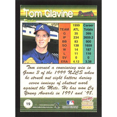 This is a 2000 Paramount Tom Glavine baseball card. The card is #19 and pictures show condition.