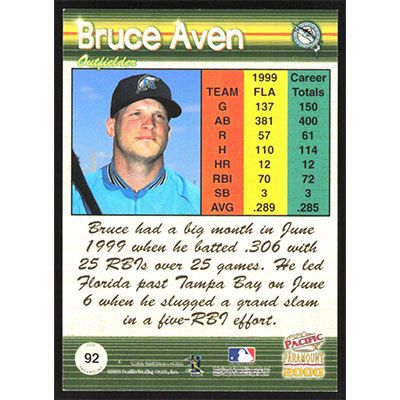 This is a 2000 Paramount Bruce Aven baseball card. The card is #92 and pictures show condition.