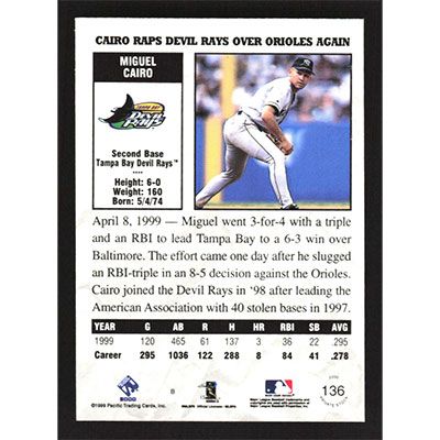 This is a 2000 Private Stock Miguel Cairo baseball card. The card is #136 and pictures show condition.