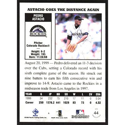 This is a 2000 Private Stock Pedro Astacio baseball card. The card is #44 and pictures show condition.