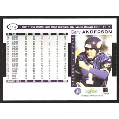 This is a 2000 Score Gary Anderson football card. The card is #114 and pictures show condition.
