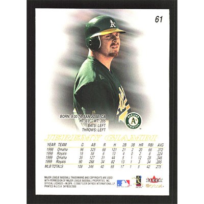 This is a 2000 SkyBox Jeremy Giambi baseball card. The card is #61 and pictures show condition.