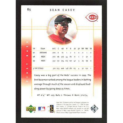 This is a 2000 SP Authentic Sean Casey baseball card. The card is #85 and pictures show condition.