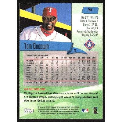 This is a 2000 Stadium Club Tom Goodwin baseball card. The card is #58 and pictures show condition.