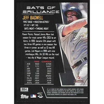 This is a 2000 Stadium Club Bats of Brilliance Jeff Bagwell baseball card. The card is #BB4 and pictures show condition.
