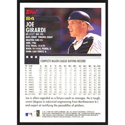 This is a 2000 Topps Joe Girardi baseball card. The card is #84 and pictures show condition.