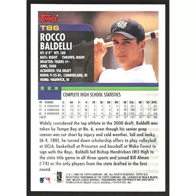 This is a 2000 Topps Traded Rocco Baldelli baseball card. The card is #T86 and pictures show condition. Team(s): Tampa Bay Devil Rays Rookie Card (RC)