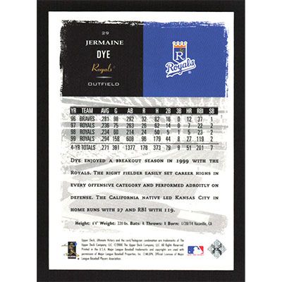 This is a 2000 Ultimate Victory Jermaine Dye baseball card. The card is #29 and pictures show condition.