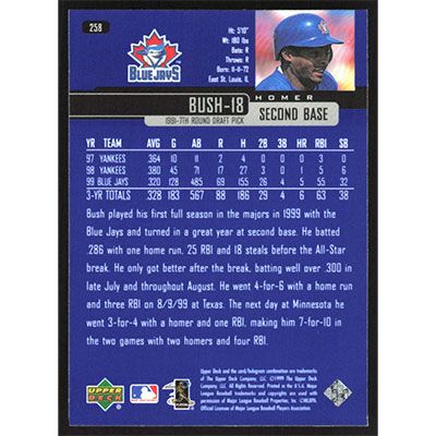 This is a 2000 Upper Deck Homer Bush baseball card. The card is #258 and pictures show condition.