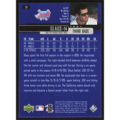 This is a 2000 Upper Deck Troy Glaus baseball card. The card is #28 and pictures show condition.