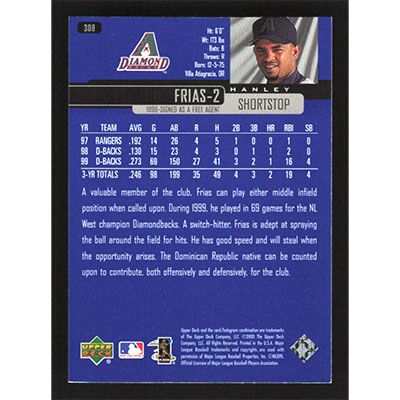This is a 2000 Upper Deck Hanley Frias baseball card. The card is #308 and pictures show condition.