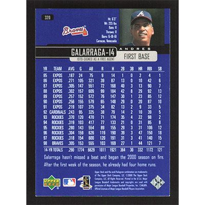 This is a 2000 Upper Deck Andres Galarraga baseball card. The card is #320 and pictures show condition.