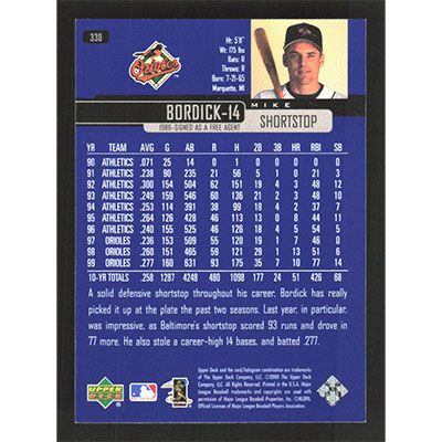 This is a 2000 Upper Deck Mike Bordick baseball card. The card is #330 and pictures show condition.