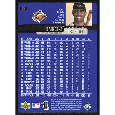 This is a 2000 Upper Deck Harold Baines baseball card. The card is #331 and pictures show condition.