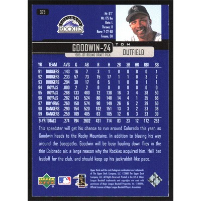 This is a 2000 Upper Deck Tom Goodwin baseball card. The card is #375 and pictures show condition.