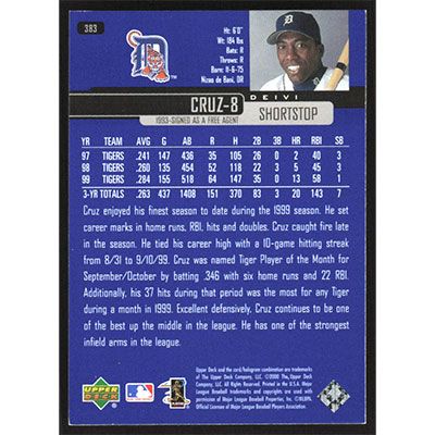 This is a 2000 Upper Deck Deivi Cruz baseball card. The card is #383 and pictures show condition.