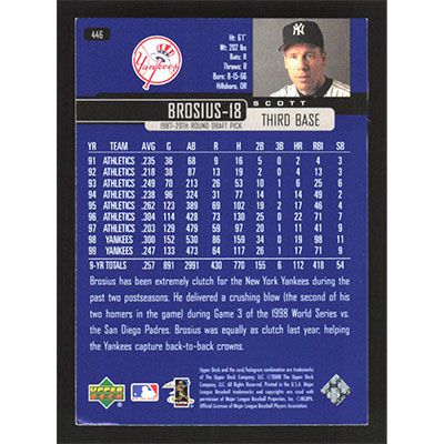 This is a 2000 Upper Deck Scott Brosius baseball card. The card is #446 and pictures show condition.