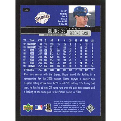 This is a 2000 Upper Deck Bret Boone baseball card. The card is #485 and pictures show condition.