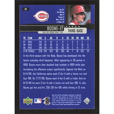 This is a 2000 Upper Deck Aaron Boone baseball card. The card is #90 and pictures show condition.