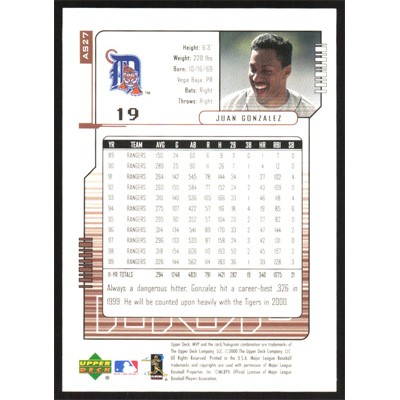 This is a 2000 Upper Deck MVP All-Star Game Juan Gonzalez baseball card. The card is #AS27 and pictures show condition.