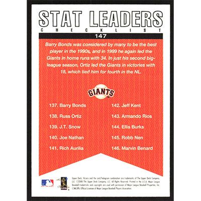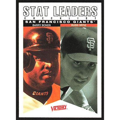 This is a 2000 Upper Deck Victory Barry Bonds and Russ Ortiz Team Leaders Checklist baseball card. The card is #147 and pictures show condition. Team(s): San Francisco Giants