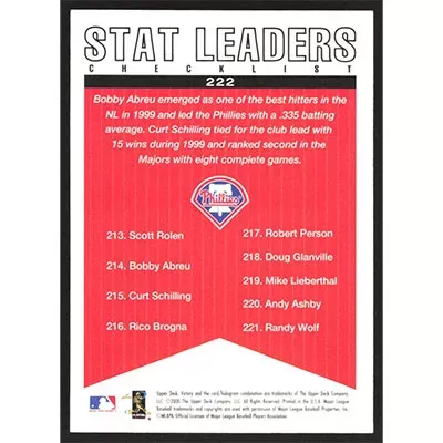 This is a 2000 Upper Deck Victory Bobby Abreu and Curt Schilling Stat Leaders Checklist baseball card. The card is #222 and pictures show condition. Team(s): Philadelphia Phillies