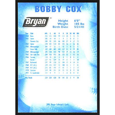 This is a 2001 Bryan Bobby Cox autographed baseball card. This card has been signed, in blue, by Bobby Cox, and is guaranteed authentic by Ballcardz.com. The card is #NNO and pictures show condition.
