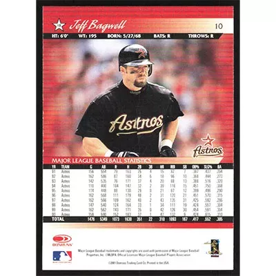 This is a 2001 Donruss Jeff Bagwell baseball card. The card is #10 and pictures show condition.
