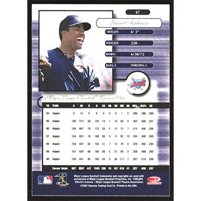 This is a 2001 Donruss Elite Garret Anderson baseball card. The card is #67 and pictures show condition.
