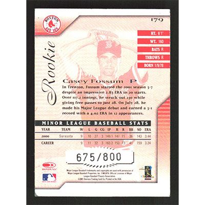 This is a 2001 Donruss Signature Series Casey Fossum baseball card. The card is #179 and pictures show condition. This card is limited; #'d 675/800. Team(s): Boston Red Sox Rookie Card (RC)