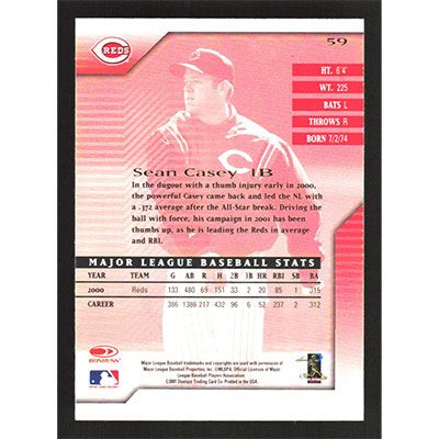 This is a 2001 Donruss Signature Series Sean Casey baseball card. The card is #59 and pictures show condition.