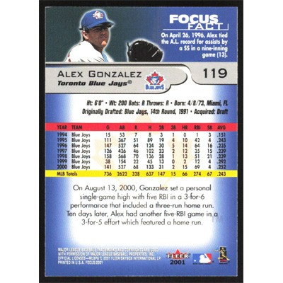 This is a 2001 Fleer Focus Alex Gonzalez baseball card. The card is #119 and pictures show condition.