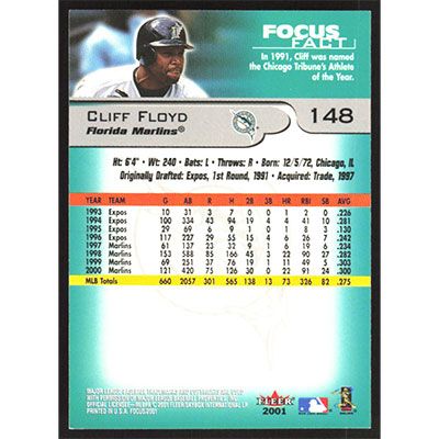This is a 2001 Fleer Focus Cliff Floyd baseball card. The card is #148 and pictures show condition.
