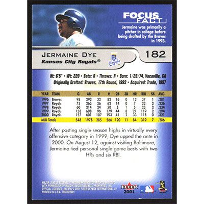 This is a 2001 Fleer Focus Jermaine Dye baseball card. The card is #182 and pictures show condition.