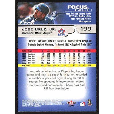 This is a 2001 Fleer Focus Jose Cruz Jr. baseball card. The card is #199 and pictures show condition.