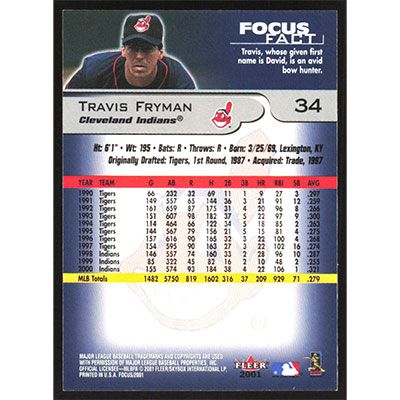 This is a 2001 Fleer Focus Travis Fryman baseball card. The card is #34 and pictures show condition.