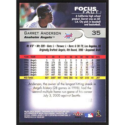 This is a 2001 Fleer Focus Garret Anderson baseball card. The card is #35 and pictures show condition.