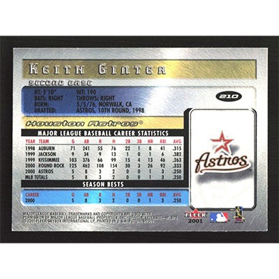 This is a 2001 Fleer Futures Keith Ginter Bright Futures baseball card. The card is #210 and pictures show condition.