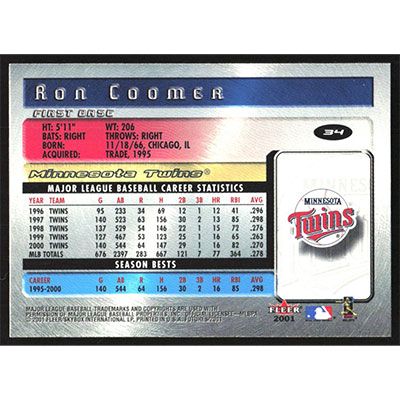This is a 2001 Fleer Futures Ron Coomer baseball card. The card is #34 and pictures show condition.